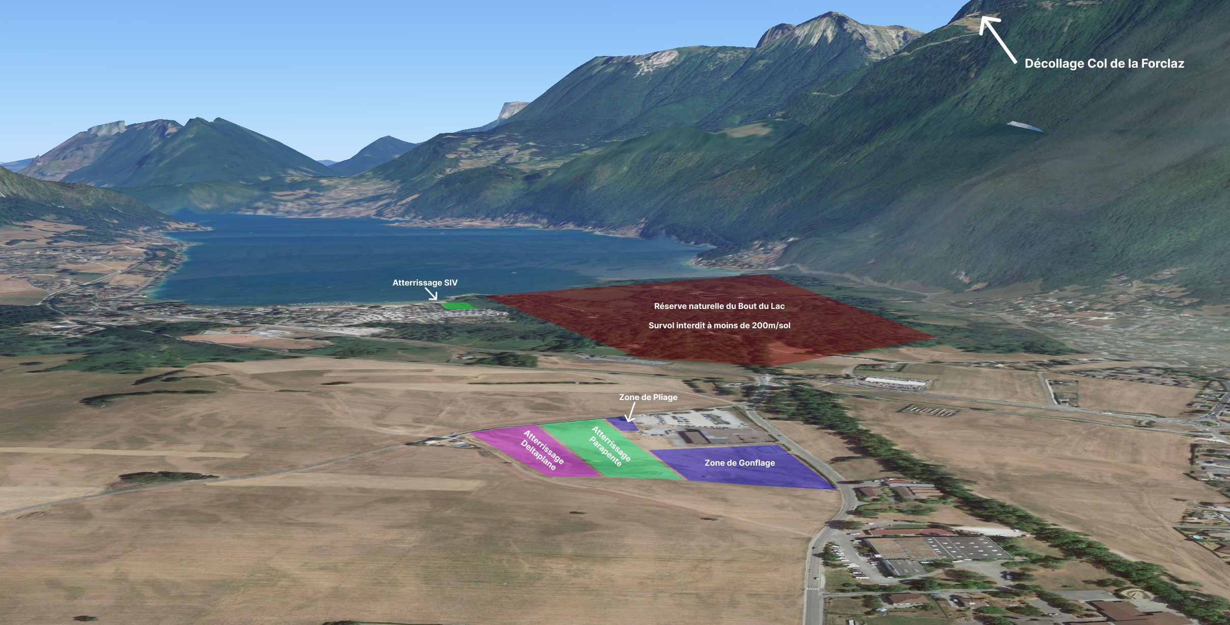 • Si vous ne participez pas à un stage SIV, il est impératif de ne pas atterrir sur la plage réservée aux stagiaires SIV. Vous devez utiliser exclusivement l’aire d’atterrissage officielle de Doussard.